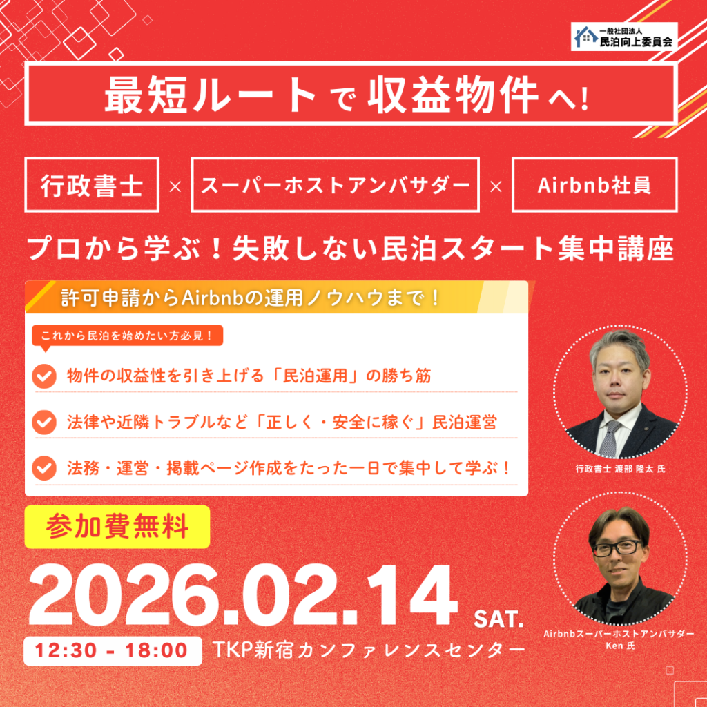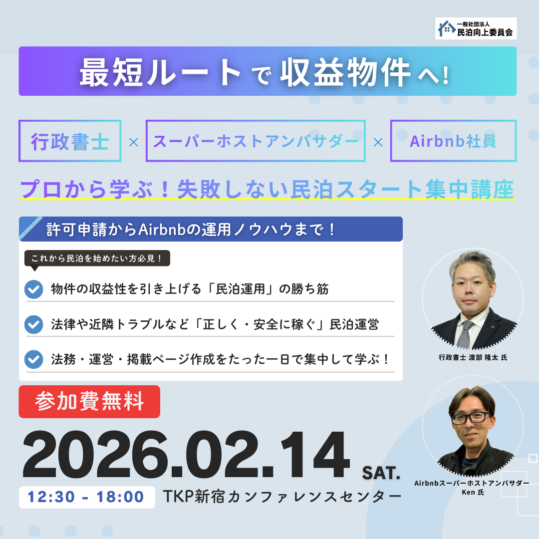 民泊スタート集中講座~東京 お知らせ 2026.02.142026.03.20 2026年2月14日(土)東京/TKP新宿カンファレンスセンターにて民泊スタート集中講座を開催しました! 48名の方にご参加いただきました。ありがとうございました。